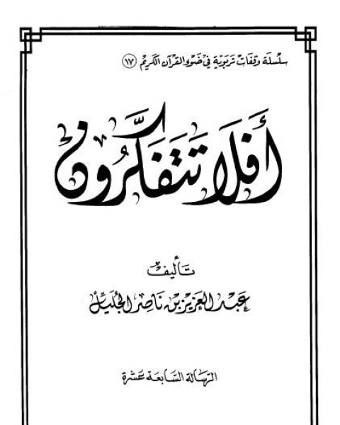 2005م - 1443هـ مؤلف الكتاب: عبدالعزيز ناصر الجليل اصدار الكتاب: الطبعة الأولى عدد صفحات الكتاب: 456 الناشر: دار طيبة للنشر والتوزيع سنة النشر: 2005 نبذة عن الكتاب: افلا تتفكرون كتاب للشيخ عبدالعزيز بن ناصر الجليل وكتاب رائع جدا .. فيه تأملات في المعجزات التي حدثت بفضل الله .. وكيف نبذ اليأس والقنوط لتتفكر بأن هناك من يحقق الأمال .. دعوة للتفكر في قصص ترى بها الضعيف ومن لا حيلة له يكون بيده الحل لانقاذ أعظم المصائب ، وكيف أنه لا مكان لكلمة مستحيل في عالم يوجد ... أفلا تتفكرونأفلا تتفكرون افلا تتفكرون كتاب للشيخ عبدالعزيز بن ناصر الجليل وكتاب رائع جدا .. فيه تأملات في المعجزات التي حدثت بفضل الله .. وكيف نبذ اليأس والقنوط لتتفكر بأن هناك من يحقق الأمال .. دعوة للتفكر في قصص ترى بها الضعيف ومن لا حيلة له يكون بيده الحل لانقاذ أعظم المصائب ، وكيف أنه لا مكان لكلمة مستحيل في عالم يوجد به من يسيره ومن يقول كن فيكون بأذنه. .