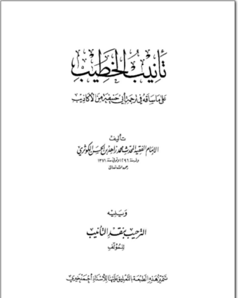 هذا كتاب تأنيب الخطيب على ماساقه في ترجمة أبي حنيفة من الأكاذيب ، وهو أحد التآليف الجليلة للإمام الشيخ محمد زاهد بن حسن الكوثري، والتي من جملتها:النكت الطريقة في الرد على إبن أبي شيبة في رده على الإمام أبي حنيفة. وقد كان إبن أبي شيبه جمع مئة وعشرون حديثاً من أحاديث الأحكام، في آخر مصنفه في باب سماه هذا ما خالف فيه أبو حنيفة الأثر . وقد رد عليه قبل الشيخ الكوثري فحول العلماء رداً مشبعاً، إلا أن نكت الشيخ الكوثري أوفى بياناً لما تضمنته تلك الأحاديث من الدلالة على المفاهيم الفقهية المستنبطة منها. وقد أعيد طبع هذا الكتاب مرات، وأراد البعض الرد عليه بكتاب سماه التنكيل ولم يتجاسر على إخراجه إلى حيز الوجود في حياة الشيخ الكوثري. إلا أن الله قد ألهمه أن هناك من ينتقده، فرد بمقدمة سماها الترحيب بنقد التأنيب وتجدر الإشارة إلى أن هذه النسخة من كتاب التأنيب فيها زيادات تمت إضافتها هي من خط المؤلف في نسخة أهداها لبعض تلاميذته، بالإضافة إلى ذلك هناك تعليقات تمت إضافتها أيضاً وكانت قد جاءت في نسخة أحمد خيري من هذا الكتاب، والتعليقات كان إستفادها المؤلف من الشيخ الكوثري، وتمت لإضافتها في هذه النسخة لينتفع بها العلماء و الطلبة.